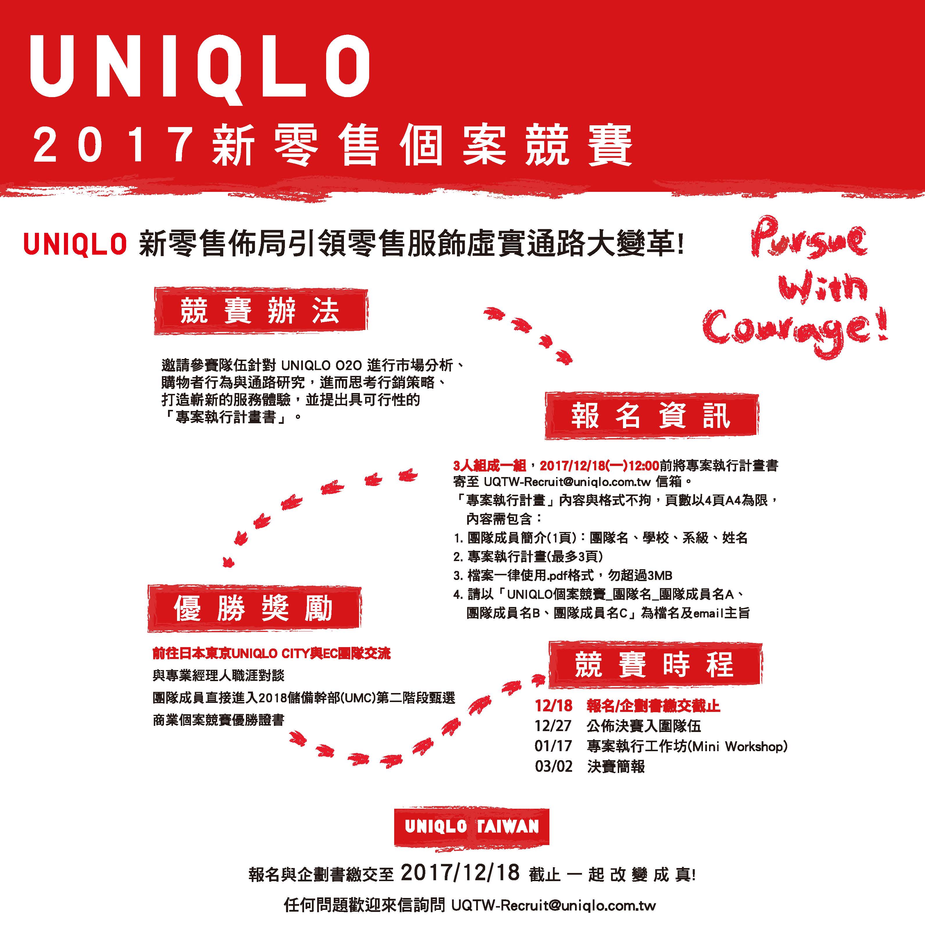 3人一組,於2017/12/18 (一) 12 : 00前將專案執行計畫書寄至 UQTW-Recruit@uniqlo.com.tw 信箱