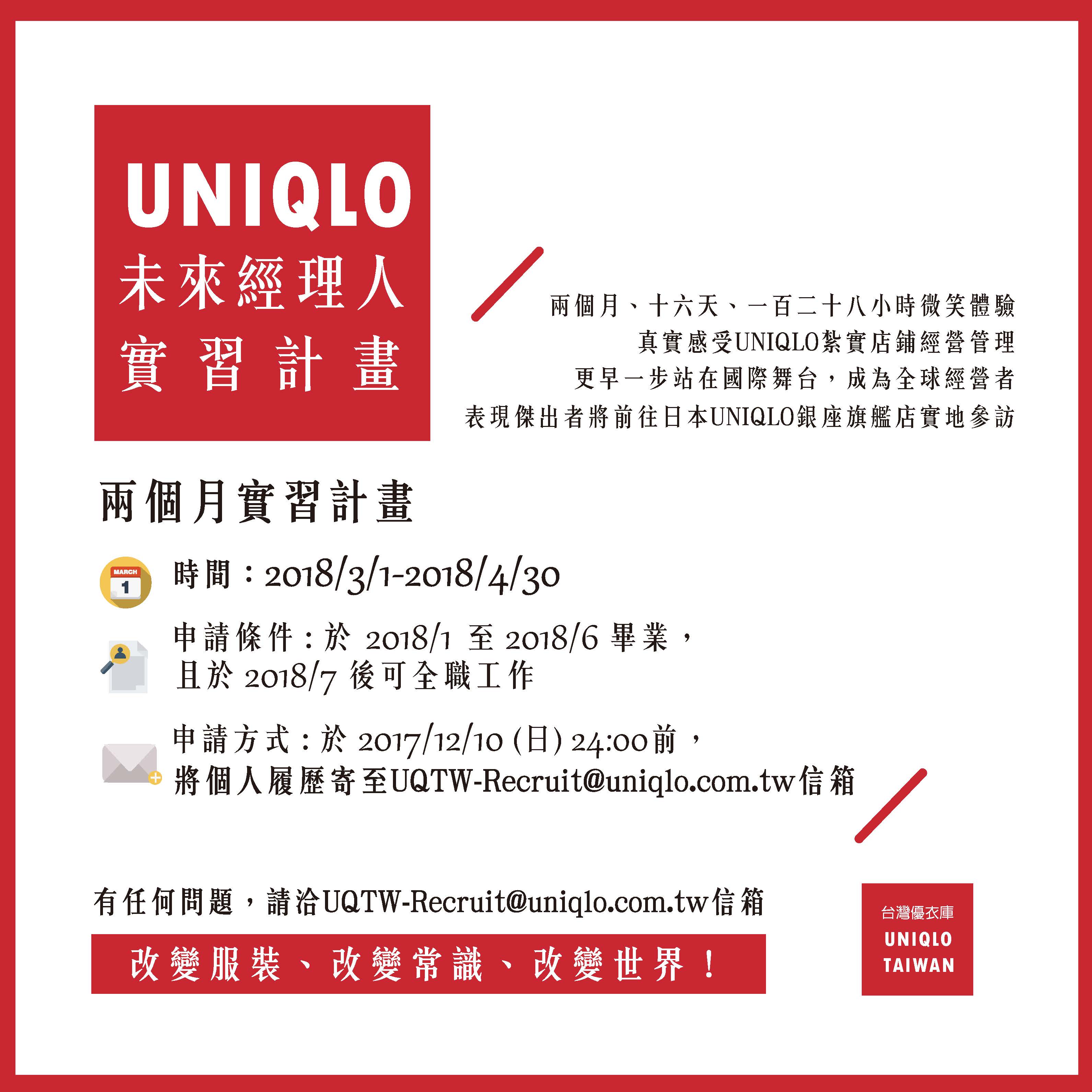 2.申請方式:2017/12/10 (日) 24 : 00前,將個人履歷寄至 UQTW-Recruit@uniqlo.com.tw 信箱