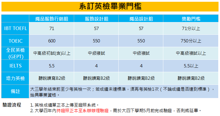 學生於研二上學期結束前繳交英文檢定成績單。若成績未達IBT TOEFL 71分或TOEIC 700分或GEPT中高級複試或IELTS 5.5者,須補修本系核可之相關英文課程。