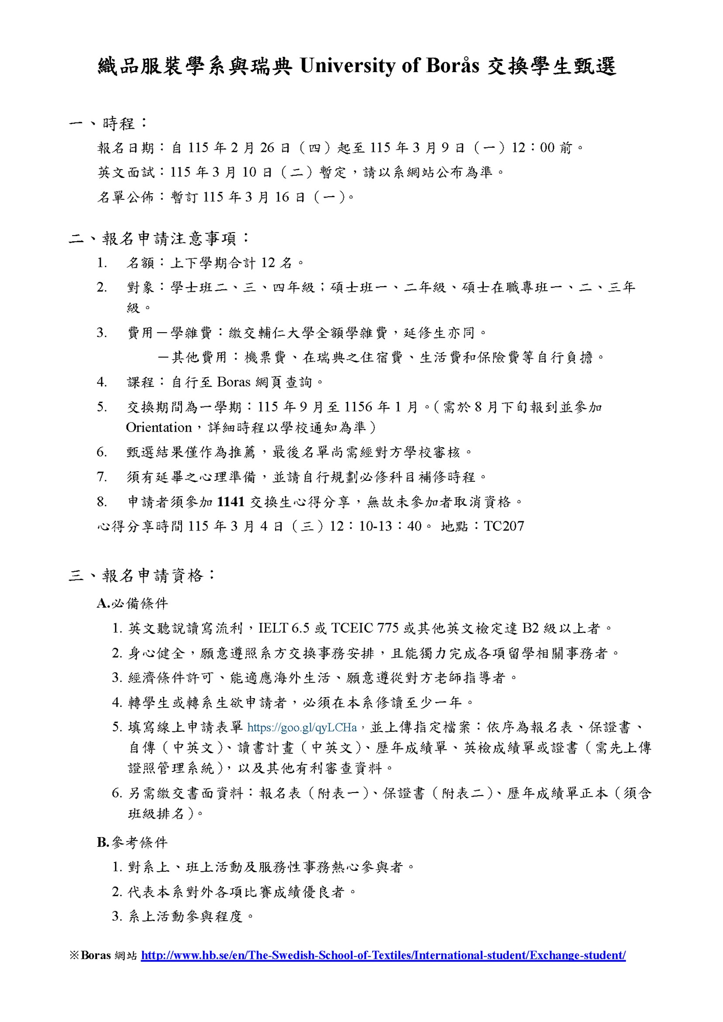 1151瑞典University of Boras交換學生申請~3/9中午12:00截止
