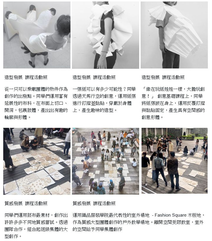 在織品服裝學系,時尚教育的目的不只是培養設計師,更希望培養有美感鑑賞能力的生活實踐家。而這門課,便是埋下美感種子並啟動時尚品味發芽的一門課。在未來四年的訓練,雖然同學們在織品設計、服裝設計與織品服飾行銷各有專精,但美感的訓練卻是最基礎也是最基礎核心的能力。用這一年所帶來的養分,希望同學們能不忘初衷,並相信並挖掘自己的獨特性,也學會分享並欣賞他人與自己的不同。雖然到大二以後,織品設計組同學會觸及更多織品相關技藝的練習,服裝設計組同學會更著重版型與服裝的探究,行銷組的同學會花更多時間學習企劃與經營。但流在學生身上的血液是對時尚與美的熱愛,這部分會與時俱進,最終可以用自己完整的作品登上自己夢想的舞台。