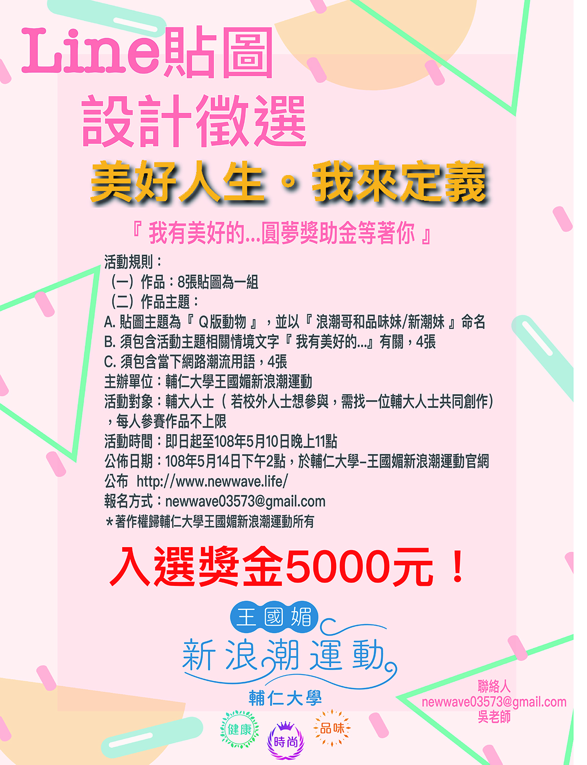 最新消息 最新公告 榮譽榜 活動公告 競賽資訊 課程公告 新生專區 獎助學金 企業求才 實習事務 展演資訊 系友動態 Line貼圖設計徵選-美好人生,我來定義 主辦單位:輔仁大學王國媚新浪潮運動 活動對象:輔大人士(若校外人士想參與,須找一位輔大人士共同創作),每人參賽作品不上限 活動時間:即日起至108年5月10日晚上11點 報名方式:newwave03573@gmail.com SHARE