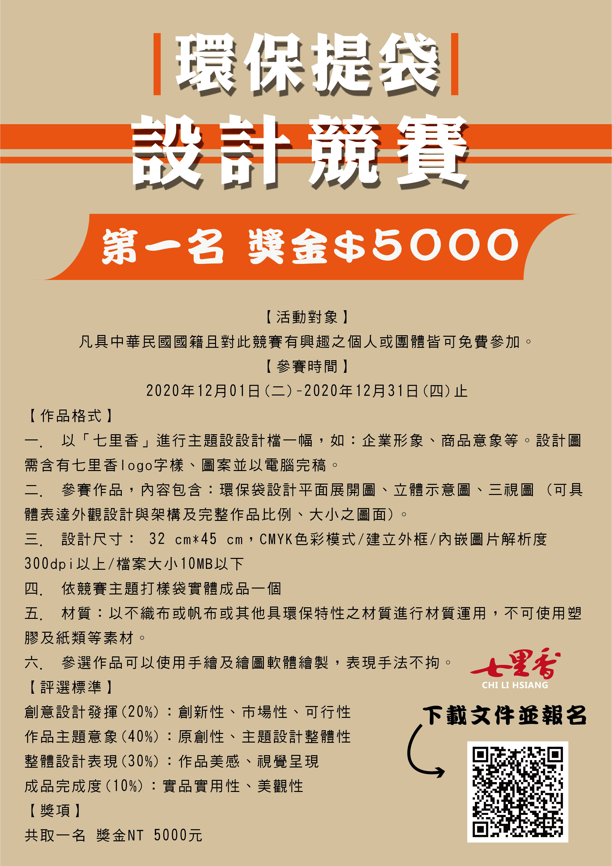 請至(https://docs.google.com/forms/d/14NpbJeHyDFNcexbHeNiWNLu-3oY0Pg02M6DXsiYgI8M/edit )下載相關文件檔案,網路繳交提袋設計檔,並將打樣設計作品繳交至「242新北市新莊區福營路125巷35號 七里香國際食品有限公司收」。