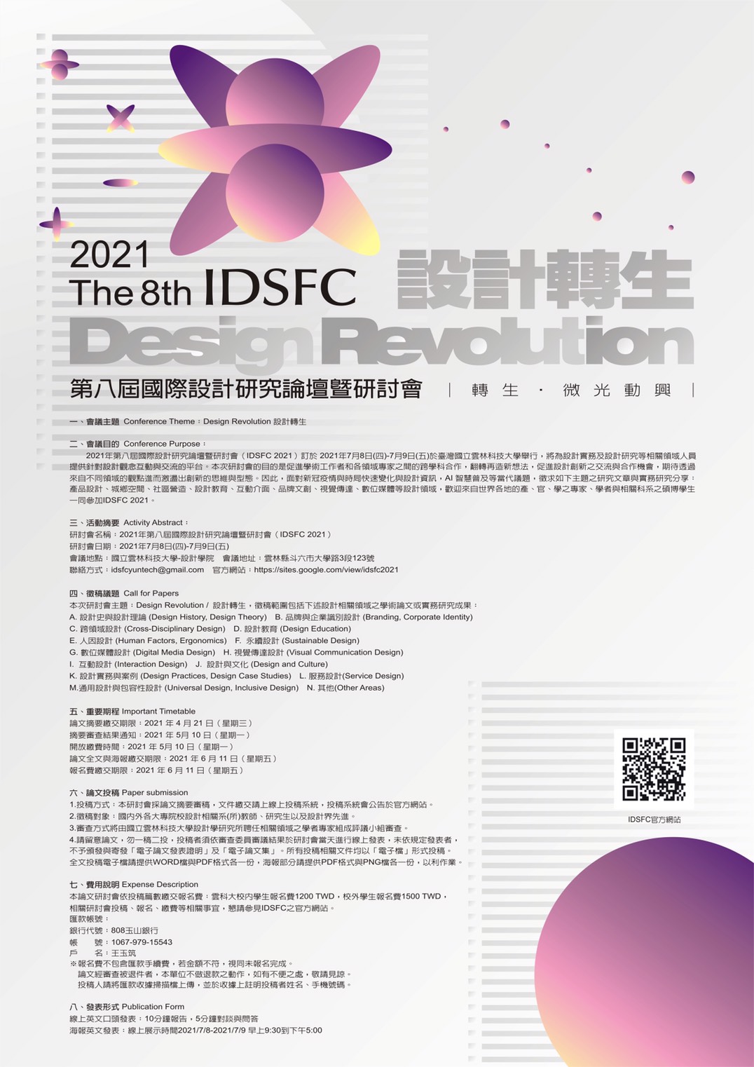 最新消息 最新公告 榮譽榜 活動公告 競賽資訊 課程公告 新生專區 獎助學金 企業求才 實習事務 展演資訊 系友動態 第八屆國際設計研究論壇暨研討會( IDSFC 2021 ) 詳細內容簡章請點以下檔案 ATTACHMENTS 第八屆國際設計研究論壇暨研討會徵稿.pdf 2021「金點概念設計獎」報名簡章.pdf SHARE