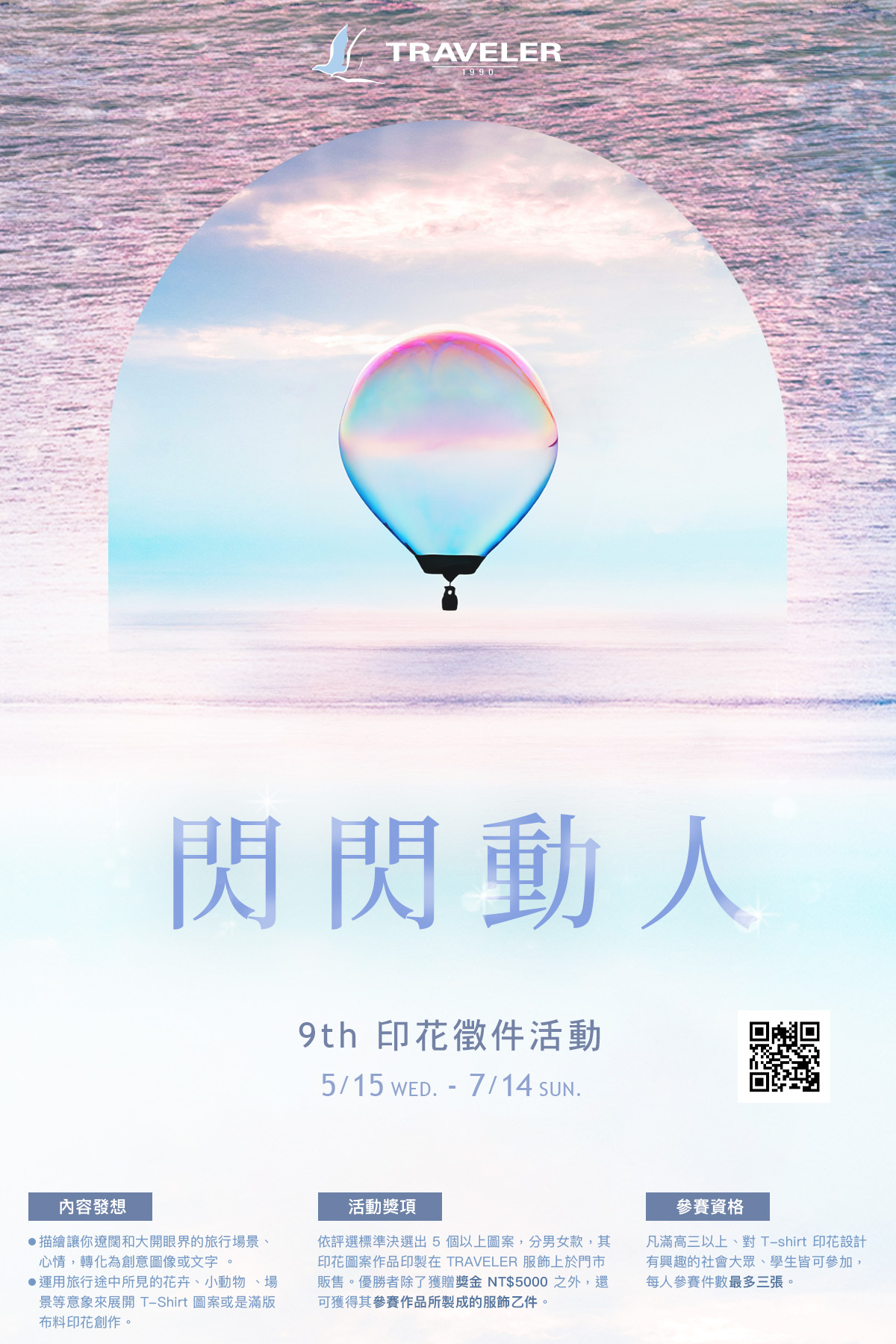 - 詳情請見附件檔 : TRAVELER 第九屆T恤印花設計徵件活動(PDF活動文件說明)以及形象視覺檔案。(形象視覺內附上活動QRcode連結圖以方便造訪網站查詢相關資訊。)