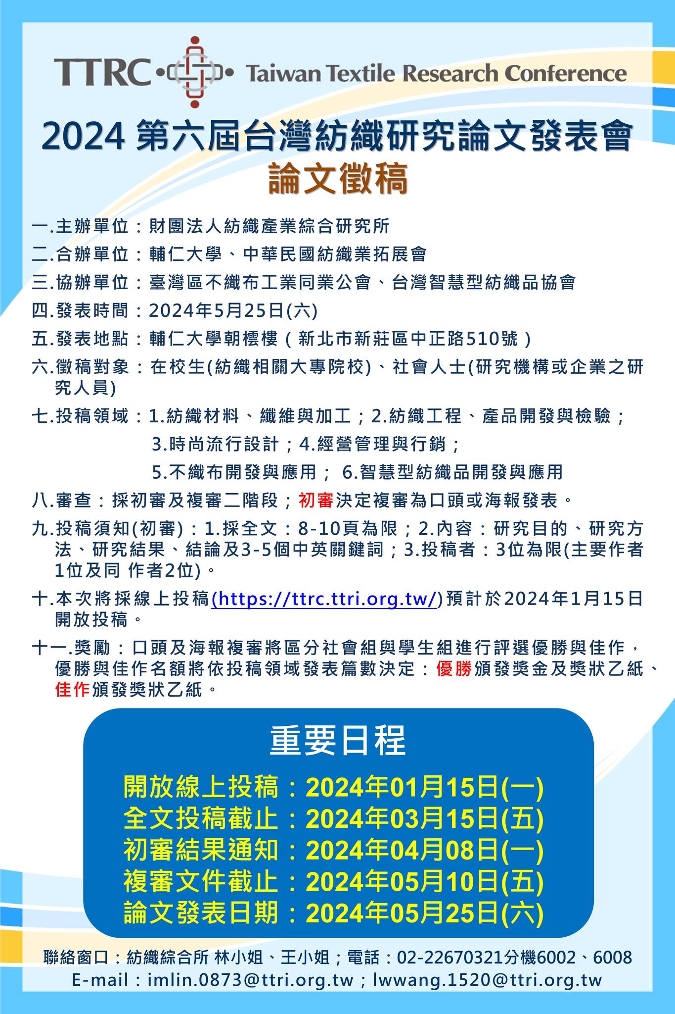 [徵稿資訊]!!延長徵稿!!2024第六屆台灣紡織研究論文發表會 開始徵稿囉!!歡迎大家踴躍報名投稿