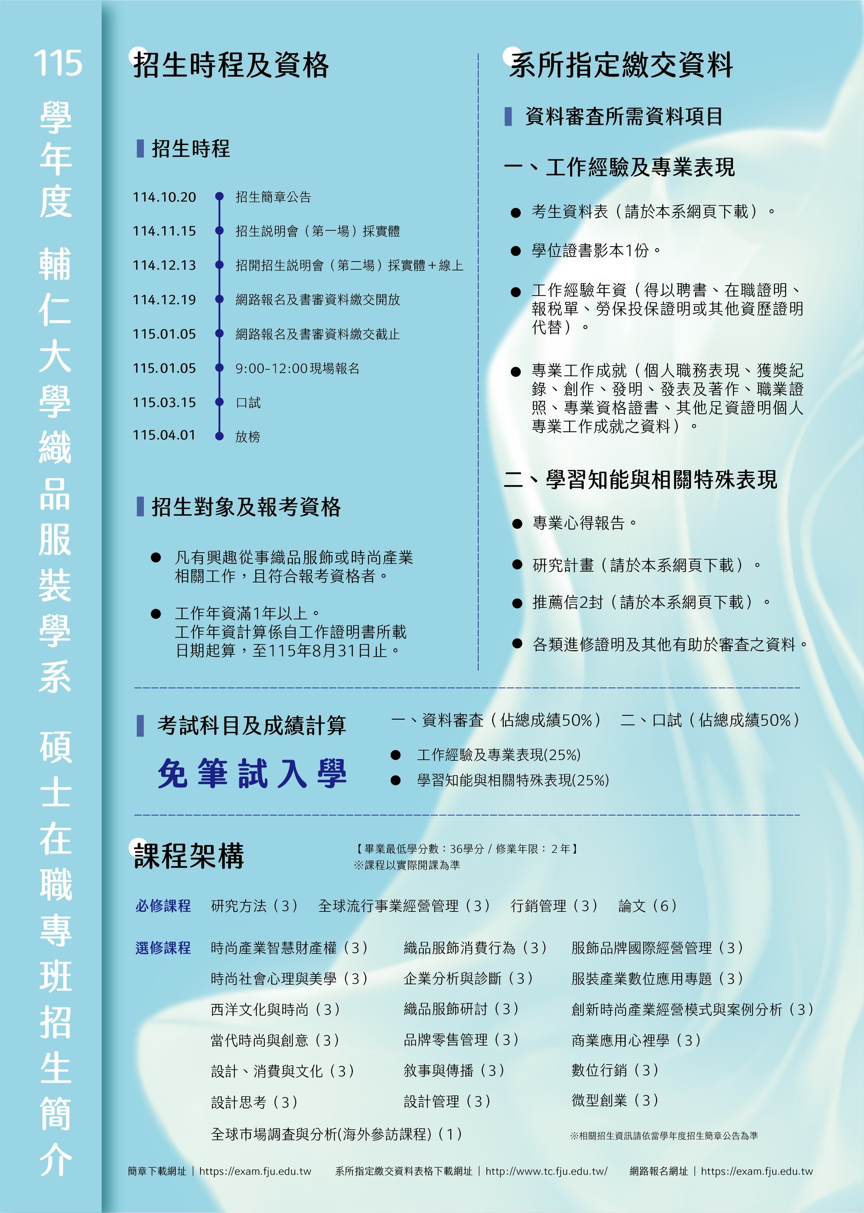 簡章下載|https://exam.fju.edu.tw (織品碩專班在p.53)