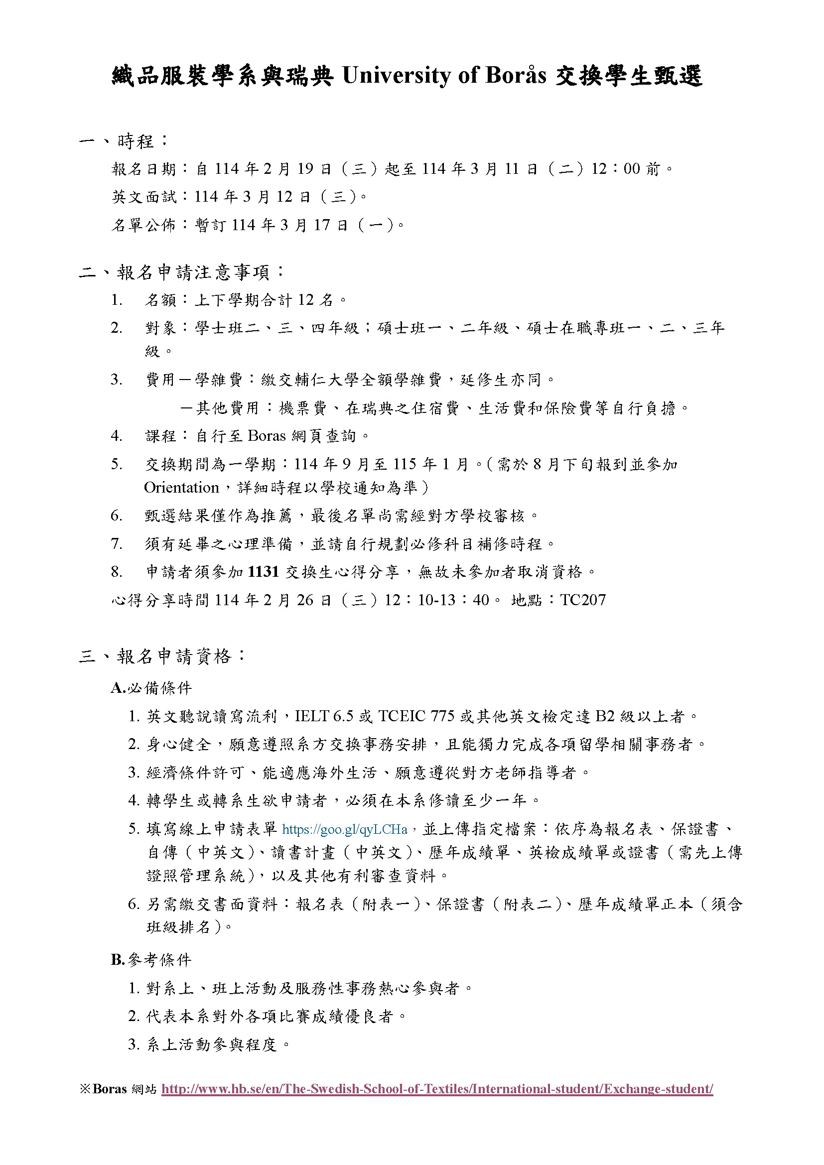 1141瑞典University of Boras交換學生申請~3/11中午12:00截止